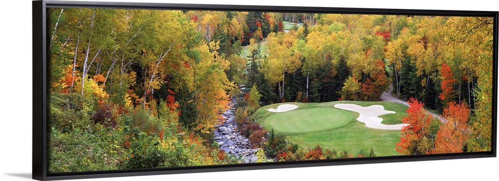 <p>View over the forest canopy of a golf course and sand traps in a clearing surrounded by trees in fall colors.</p>