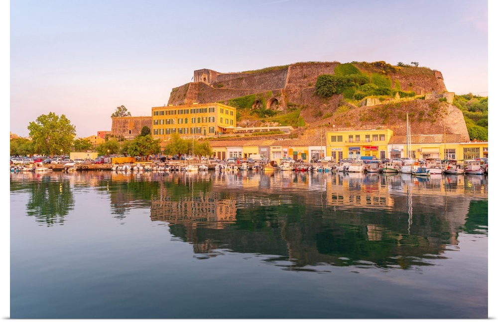 <p>View of the New Fortress overlooking the Old Port Marina at sunset, Corfu, Ionian Sea, Greek Islands, Greece, Europe</p>