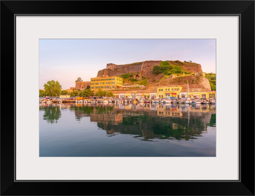 <p>View of the New Fortress overlooking the Old Port Marina at sunset, Corfu, Ionian Sea, Greek Islands, Greece, Europe</p>