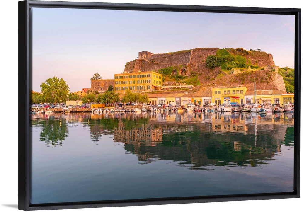 <p>View of the New Fortress overlooking the Old Port Marina at sunset, Corfu, Ionian Sea, Greek Islands, Greece, Europe</p>