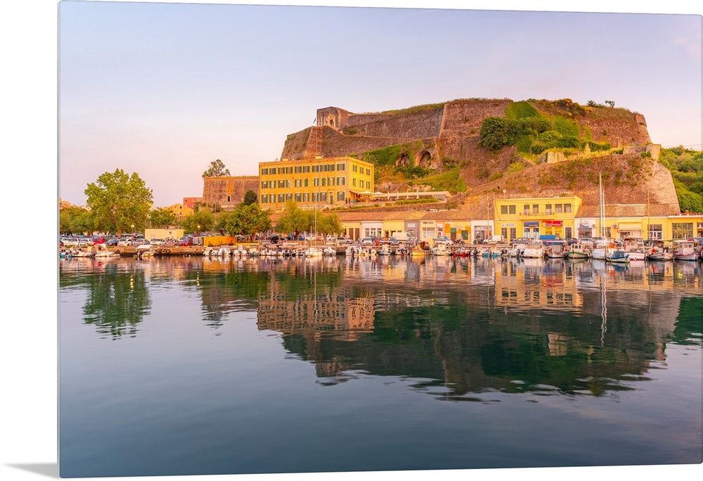 <p>View of the New Fortress overlooking the Old Port Marina at sunset, Corfu, Ionian Sea, Greek Islands, Greece, Europe</p>