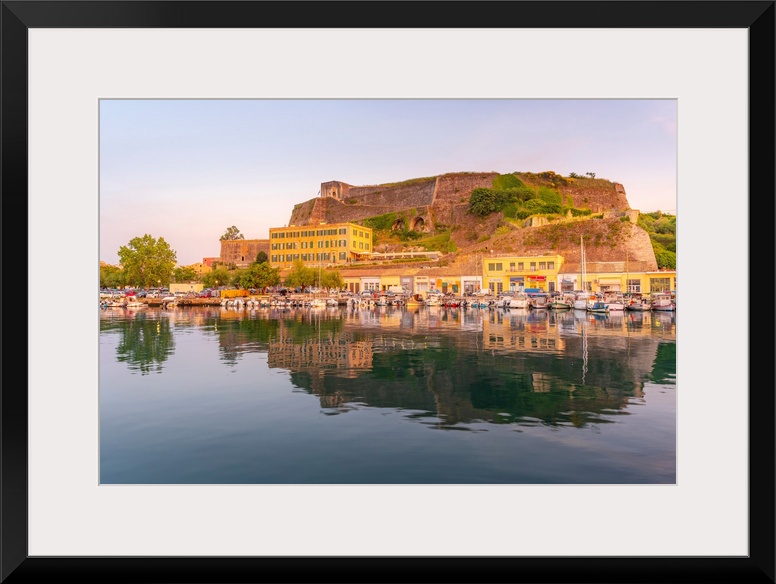<p>View of the New Fortress overlooking the Old Port Marina at sunset, Corfu, Ionian Sea, Greek Islands, Greece, Europe</p>