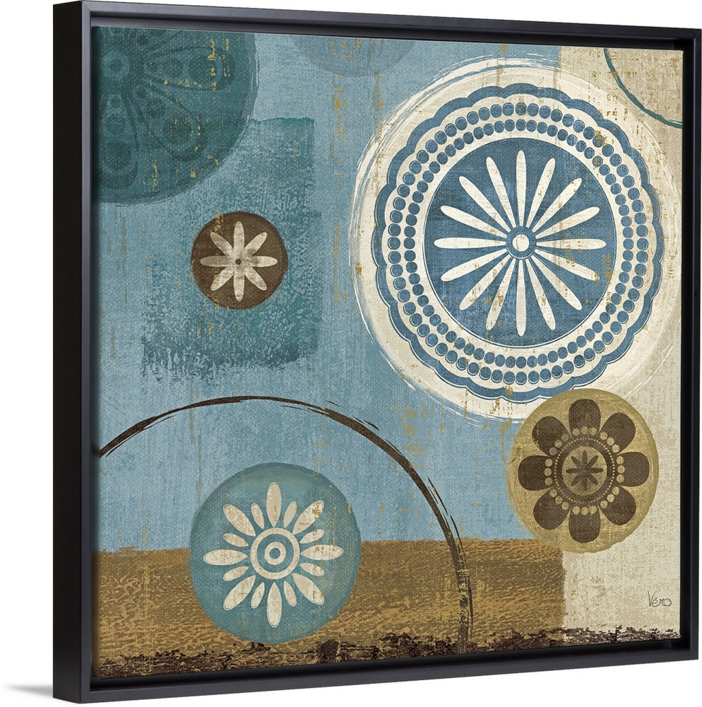 <p>Large wall picture with a hint of a traditional design with circular flower shaped designs mixed with a rectangular background. Mix of cooling and netural tones.</p>