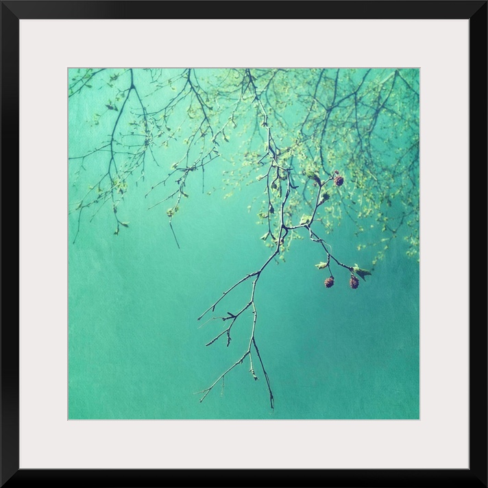 <p>An artistic photograph of spindly tree branches hanging from the top of the image against a vibrant teal green background.</p>