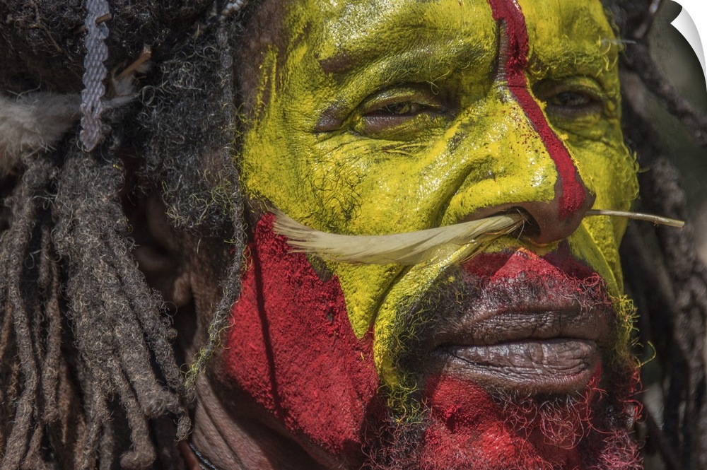 <p>New guinea man in the Wabia village of the tari valley area of the southern highlands. He is part of a group preparing to perform a 'sun dance' to help the ill, Wabia, southern highlands, papua new guinea.</p>