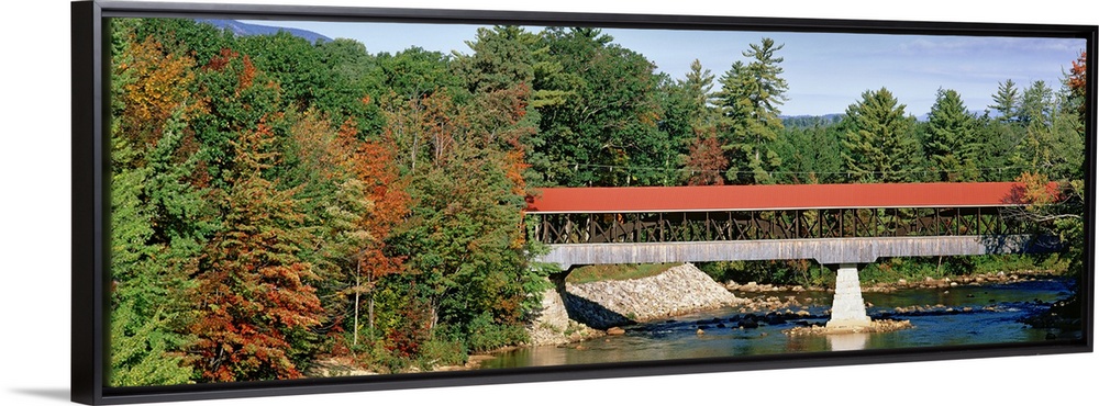 <p>Panoramic image of a red roofed covered bridge spanning a calm tree lined river.</p>