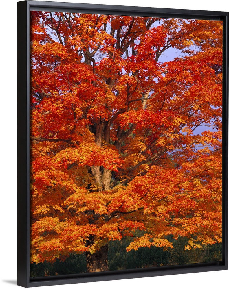 <p>Big vertical photograph of the branches of a sugar maple tree, covered in vibrant autumn colored leaves, in New Hampshire.</p>