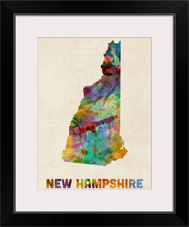 <p>Contemporary piece of artwork of a map of New Hampshire made up of watercolor splashes.</p>