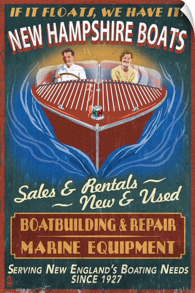 <p>Retro stylized art poster of a happy couple driving a wooden speed boat.</p>
