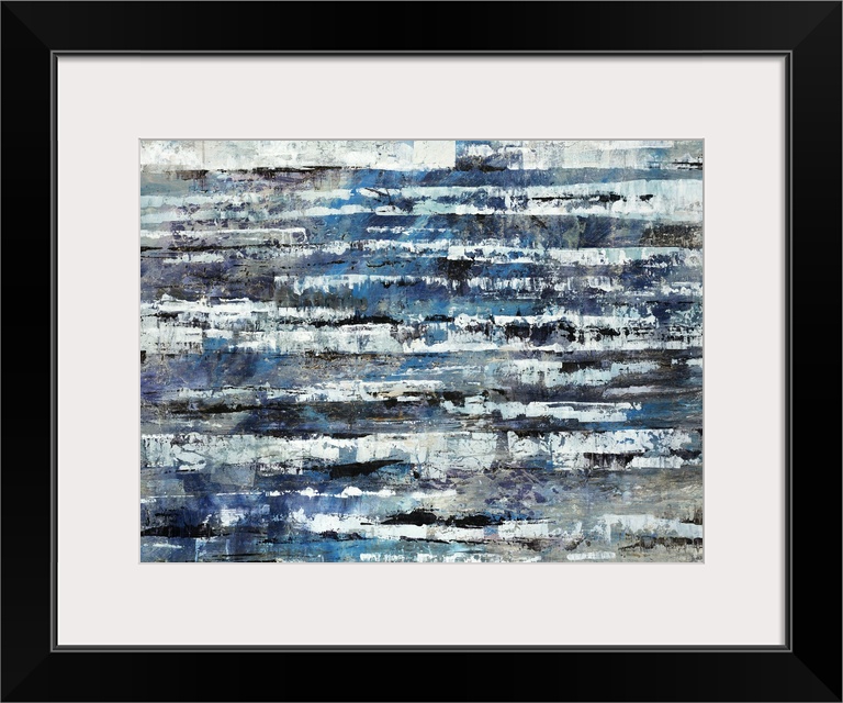 <p>Oversized, horizontal abstract wall hanging in cool tones of harsh, patchy horizontal lines of various sizes.</p>