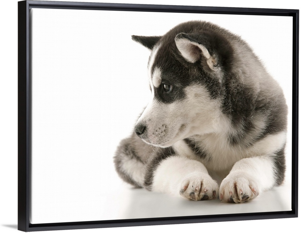<p>New cute happy fluffy puppy Husky laying down and looking off to the side on set with a white background for happiness family</p>