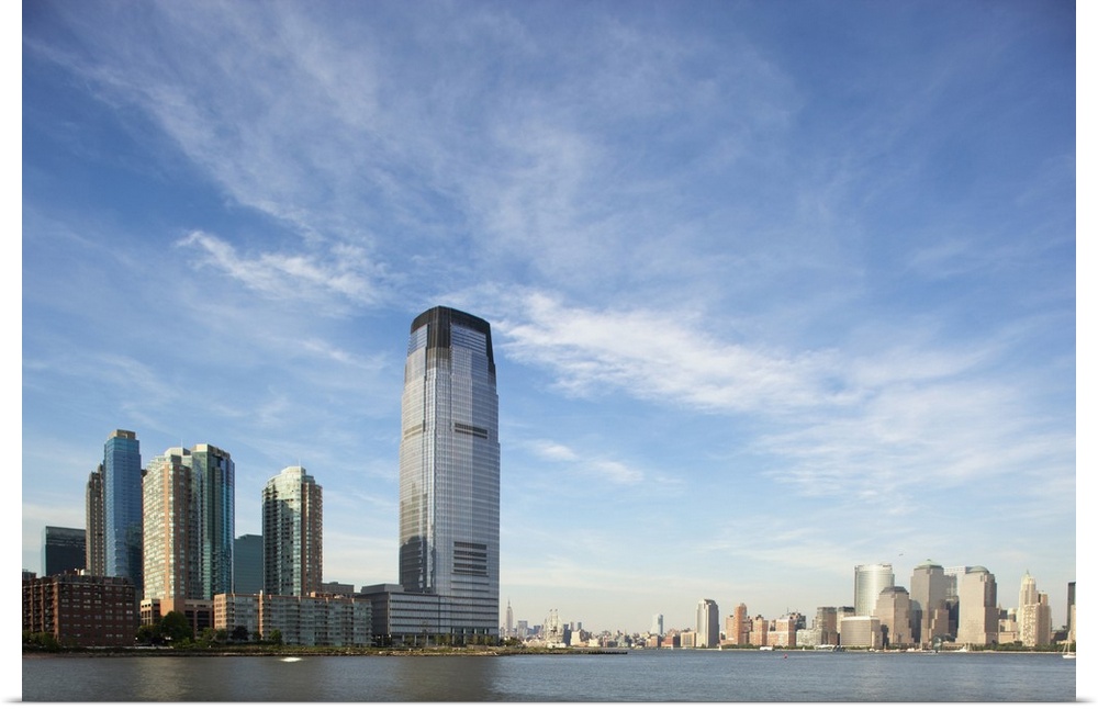 <p>USA, New Jersey, Jersey City, Manhattan skyline rises above Hudson River across from rising skyscrapers of Jersey City skyline on summer evening</p>