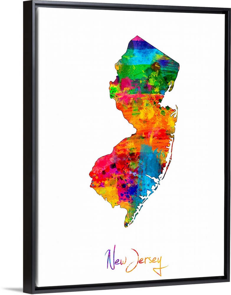 <p>Contemporary artwork of a map of New Jersey made of colorful paint splashes.</p>