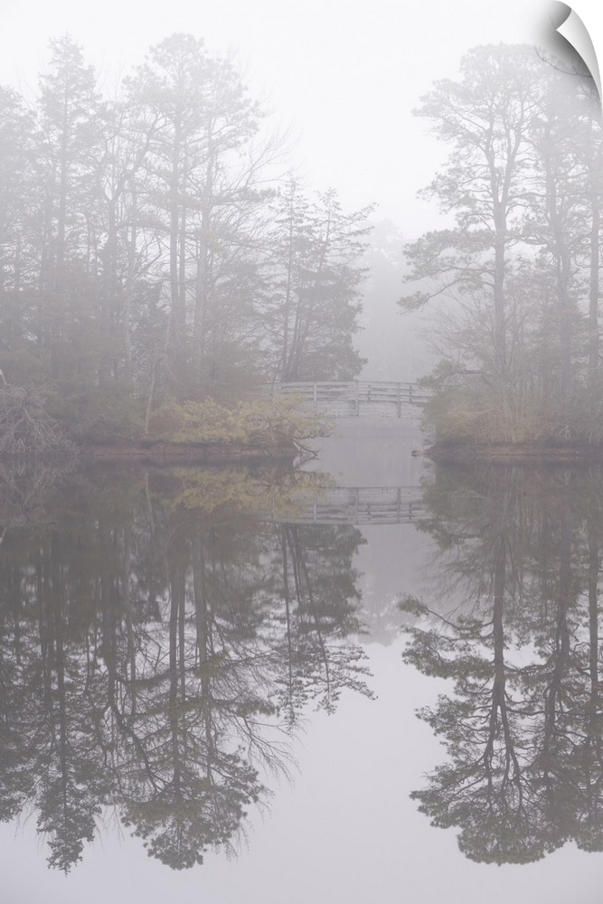 <p>USA, New Jersey, Pine Barrens National Preserve. Foggy forest landscape and bridge reflect in lake. United States, New Jersey.</p>