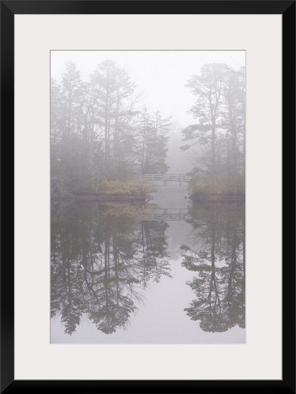 <p>USA, New Jersey, Pine Barrens National Preserve. Foggy forest landscape and bridge reflect in lake. United States, New Jersey.</p>
