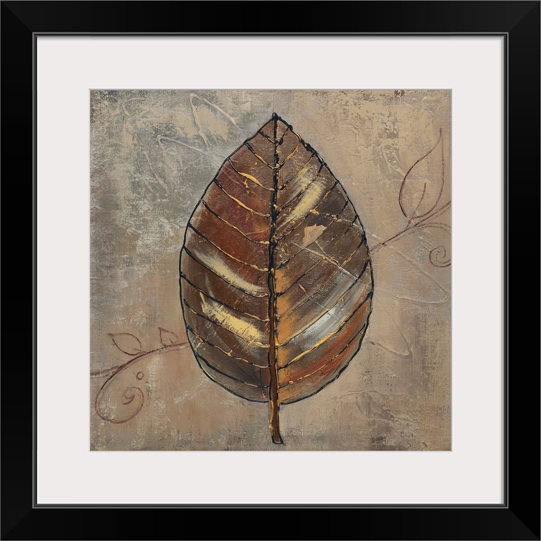<p>Contemporary of a mixed media brown leaf with gold color detail over a mottled green background.</p>
