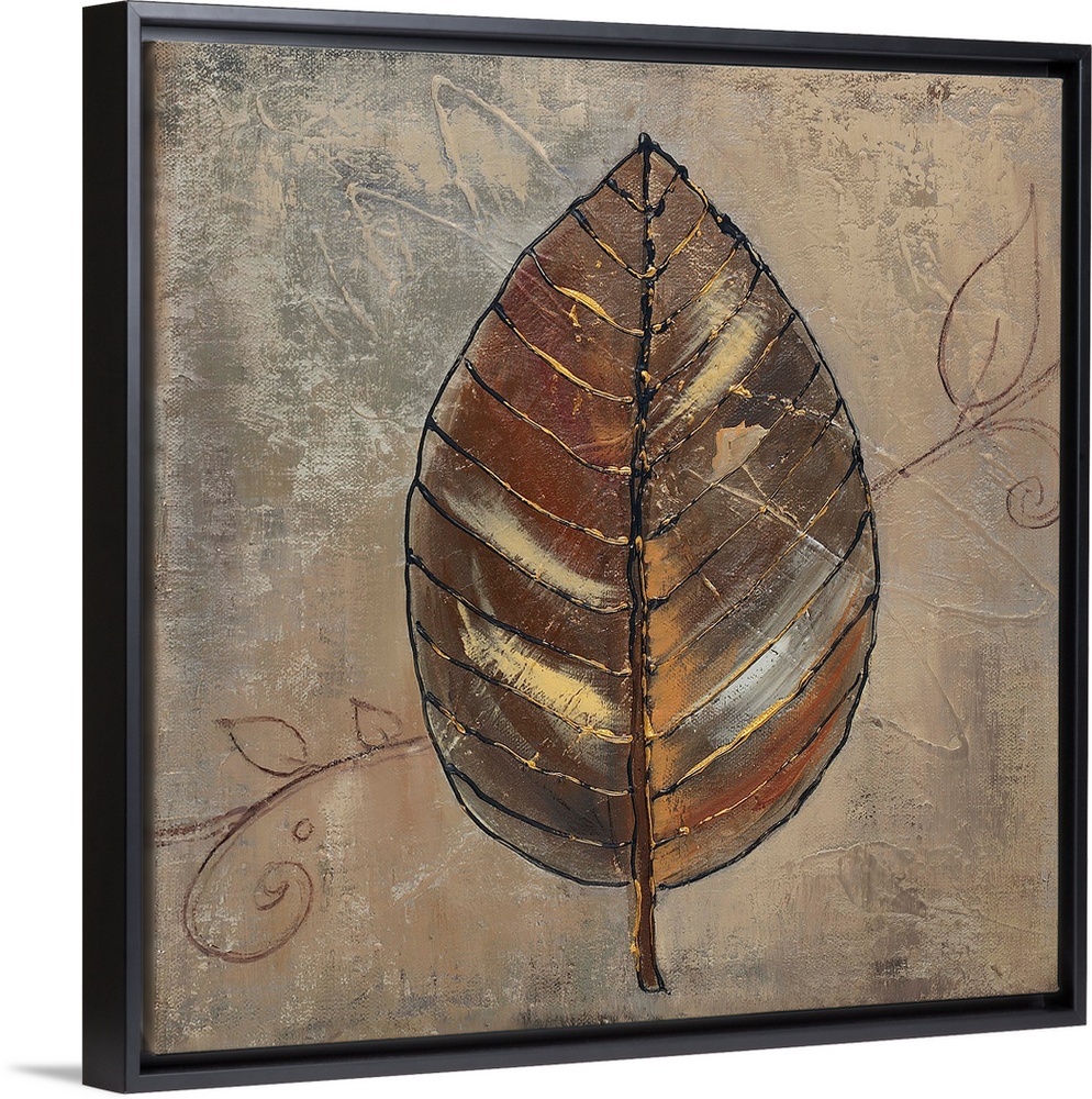 <p>Contemporary of a mixed media brown leaf with gold color detail over a mottled green background.</p>