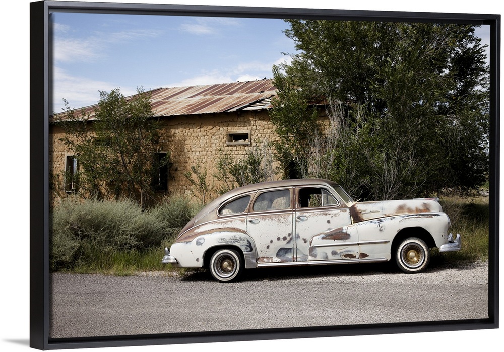 <p>Old worn classic car parked on the side of the road</p>