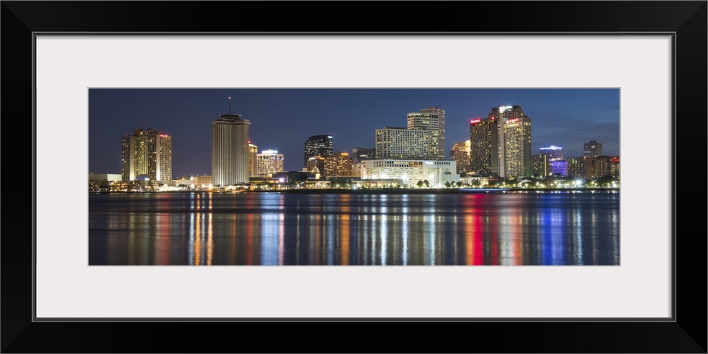 <p>Panoramic photograph of the New Orleans skyline lit up at night and reflecting colorful bands onto the Mississippi River.</p>