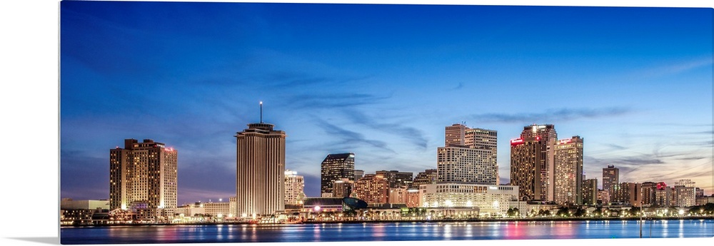 <p>Panoramic photograph of the New Orleans skyline lit up at sunset.</p>