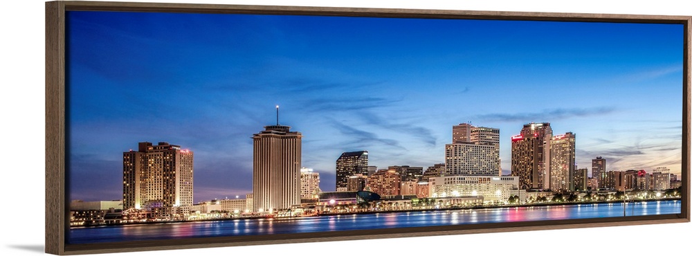 <p>Panoramic photograph of the New Orleans skyline lit up at sunset.</p>