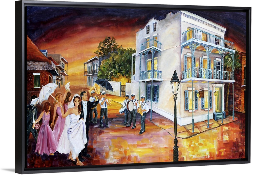 <p>A bride and groom with the bridal party celebrating in the streets of New Orleans.</p>