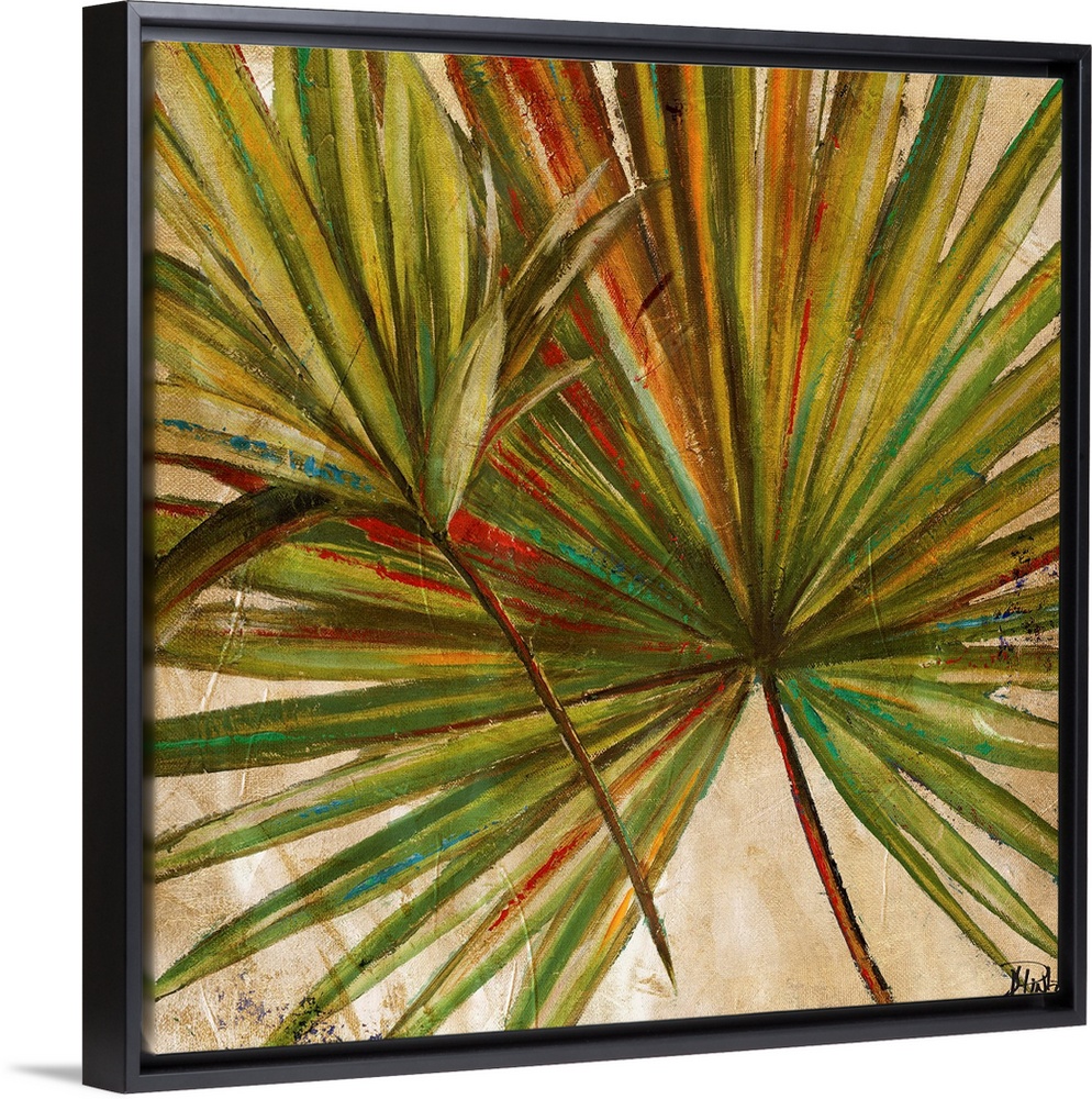 <p>Painting of a vibrant green palm frond against a beige background.</p>