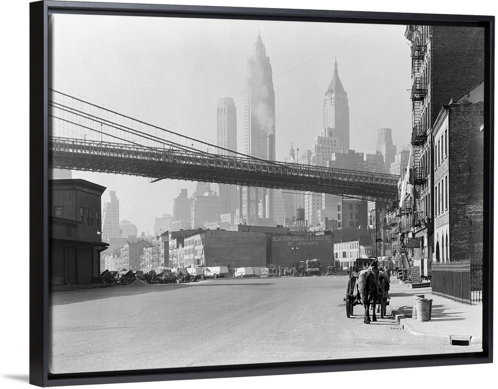 <p>New Your City's South Street, Nov. 28, 1933. The Brooklyn Bridge spans over the street, with the skyscrapers of the Financial District in the distance. Photo by Samuel H. Gottscho.</p>
