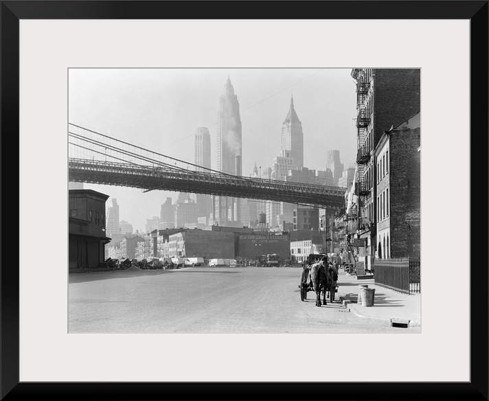 <p>New Your City's South Street, Nov. 28, 1933. The Brooklyn Bridge spans over the street, with the skyscrapers of the Financial District in the distance. Photo by Samuel H. Gottscho.</p>