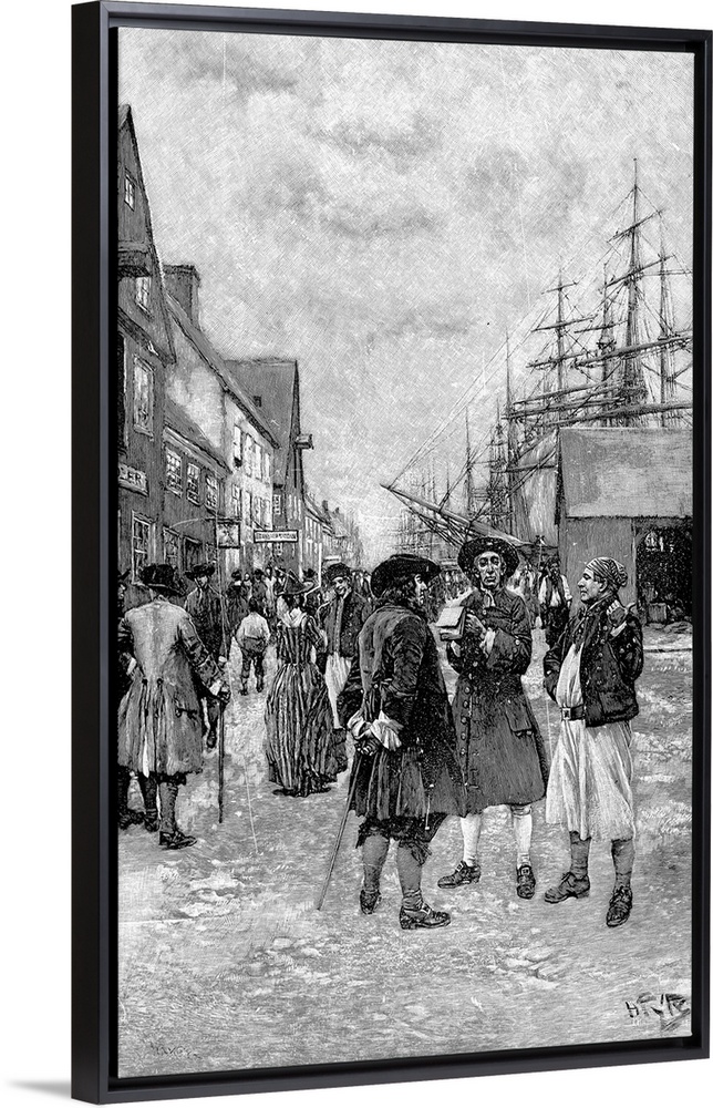 <p>Along the waterfront in old New York. Wood engraving, American, 1893, after Howard Pyle.</p>