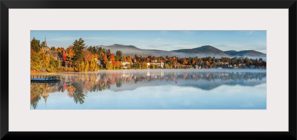<p>USA, New York, Adirondack Mountains, Lake Placid, Mirror Lake fog at dawn</p>