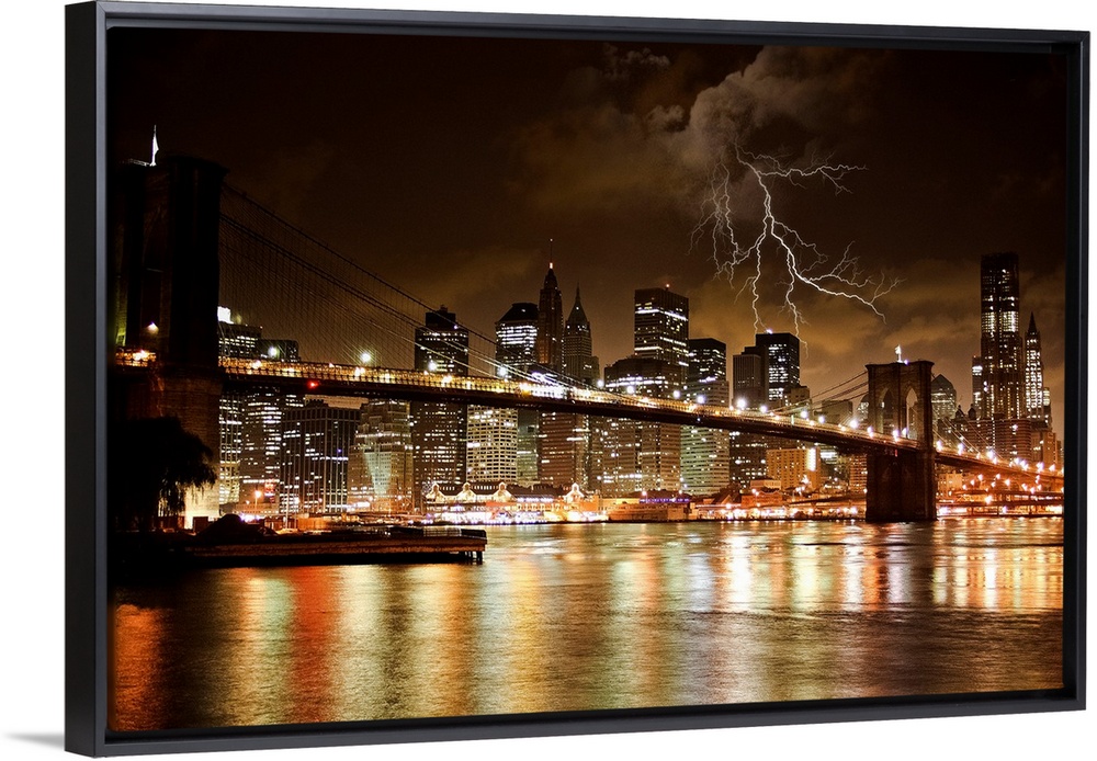 <p>Night shot of the Brooklyn Bridge and Manhattan skyline at night under a bolts of lightning.</p>