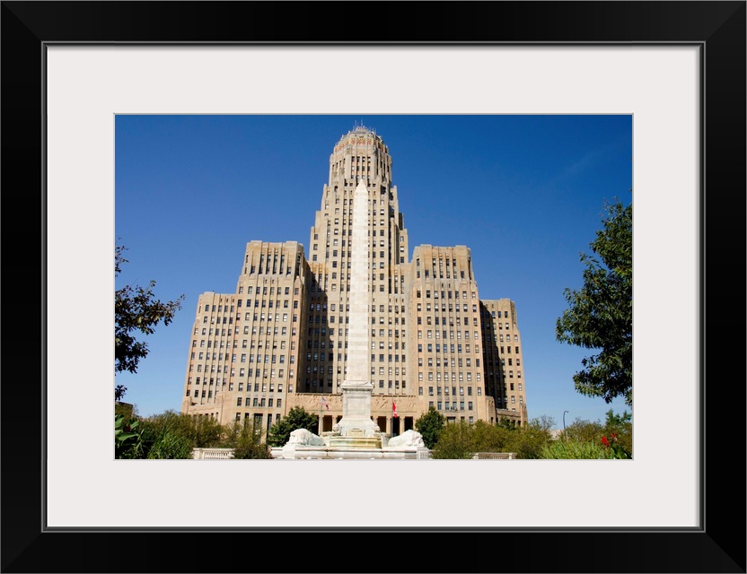 <p>New York, Buffalo. Historic art deco City Hall with the McKinley Monument fountain and obelisk.</p>