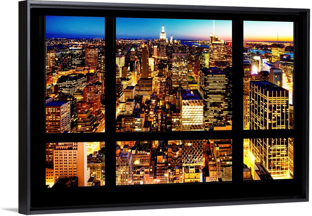 <p>The New York City skyline lit up in the evening, with a faux window pane effect.</p>