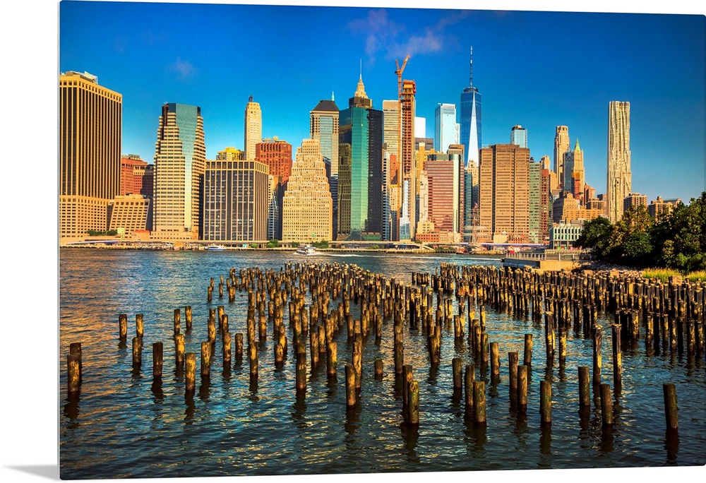 <p>New York City, Brooklyn, Brooklyn Bridge Park, wooden piles, Lower Manhattan Financial District skyline skyscraper..</p>
