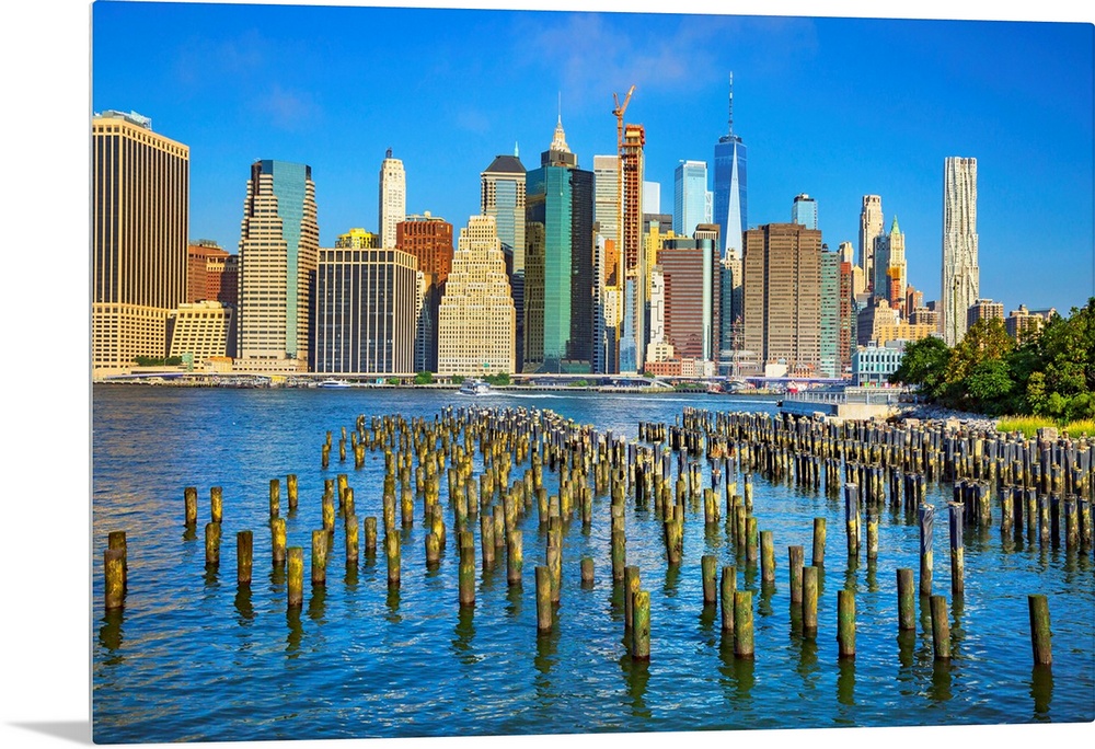 <p>New York City, Brooklyn, Brooklyn Bridge Park, wooden piles, Lower Manhattan Financial District skyline skyscraper..</p>