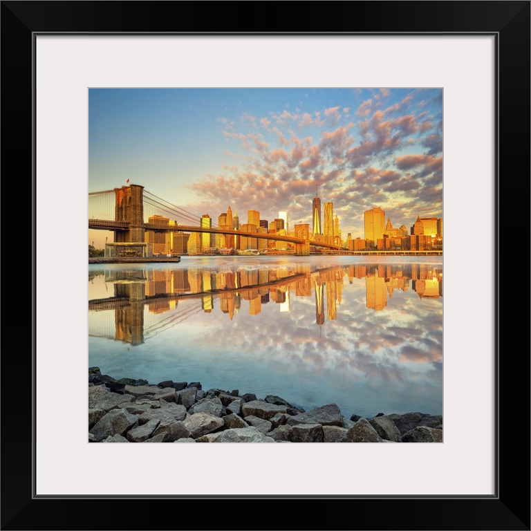 <p>USA, New York City, East River, Manhattan, Brooklyn Bridge, East River and the downtown Manhattan skyline at dawn, view from the Empire Fulton Ferry (part of Brooklyn Bridge Park).</p>