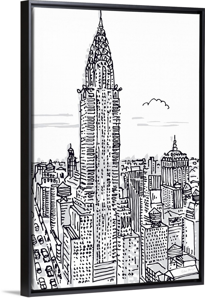 <p>Pen and ink illustration of the skyline of New York City with the Chrysler Building in the foreground.</p>