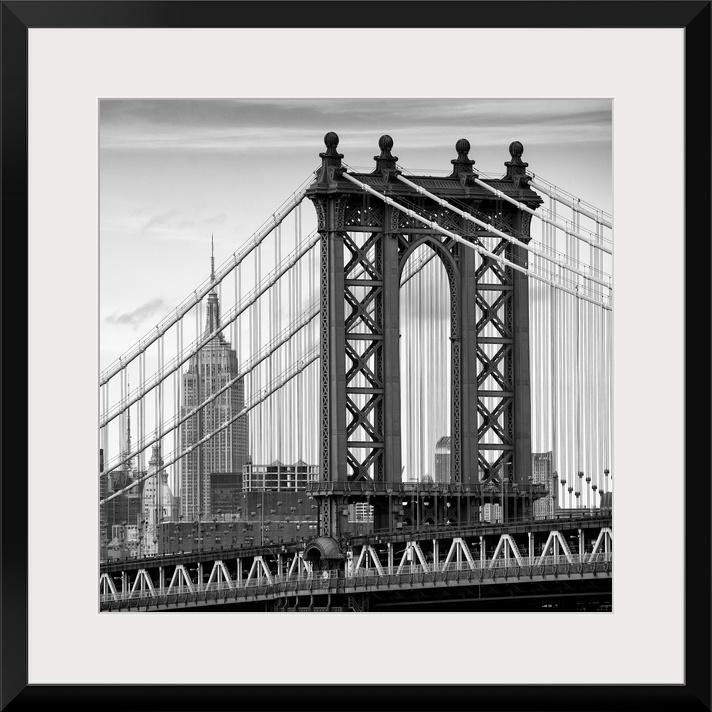 <p>A black and white photograph of the Manhattan bridge, with the Empire state building in the background.</p>