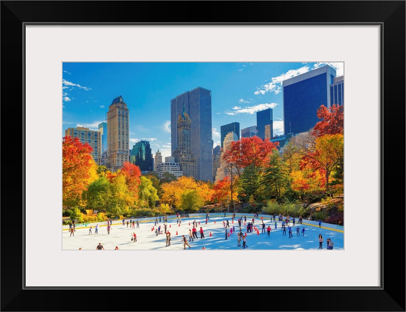 <p>USA, New York City, Manhattan, Central Park, Wollman Rink, Ice rink, Fifth Avenue skyline in the background.</p>