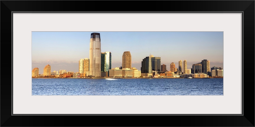 <p>USA, New York City, Manhattan, Lower Manhattan, Jersey Skyline at dawn, view from South Cove Park.</p>