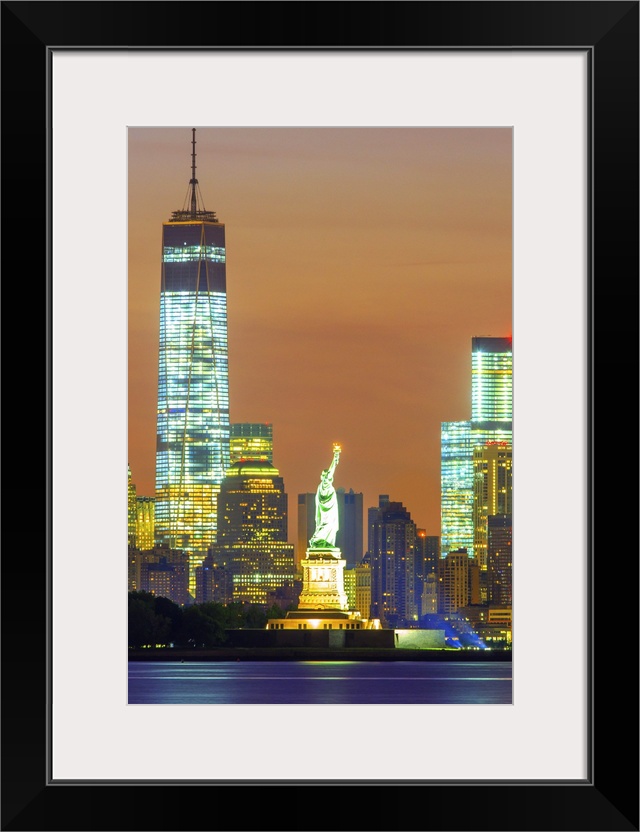 <p>USA, New York City, Manhattan, Lower Manhattan, Liberty Island, Statue of Liberty, Lower Manhattan with Freedom Tower and Statue of Liberty at sunset.</p>