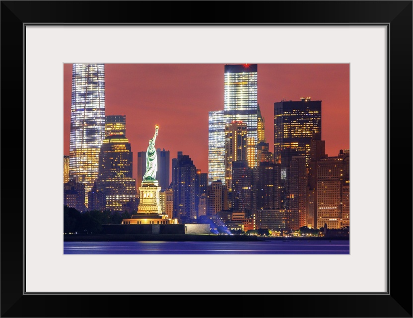 <p>USA, New York City, Manhattan, Lower Manhattan, Liberty Island, Statue of Liberty, Lower Manhattan with Freedom Tower and Statue of Liberty at sunset.</p>