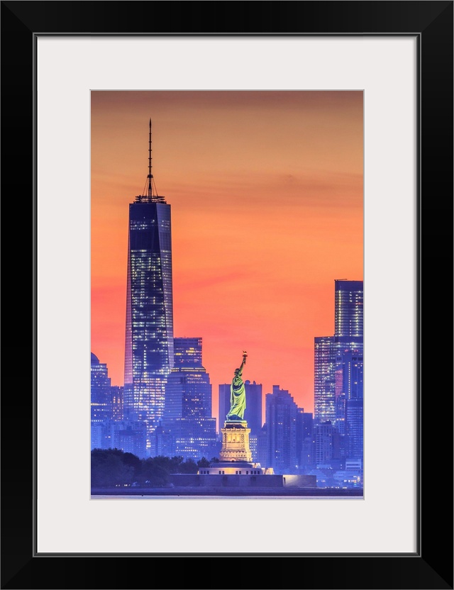 <p>USA, New York City, Manhattan, Lower Manhattan, Liberty Island, Statue of Liberty, Lower Manhattan with Freedom Tower and Statue of Liberty at sunset.</p>