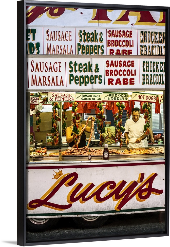<p>USA, New York City, Manhattan, Lower Manhattan, Little Italy, Grilled sausage stall, San Gennaro Feast, Little Italy.</p>