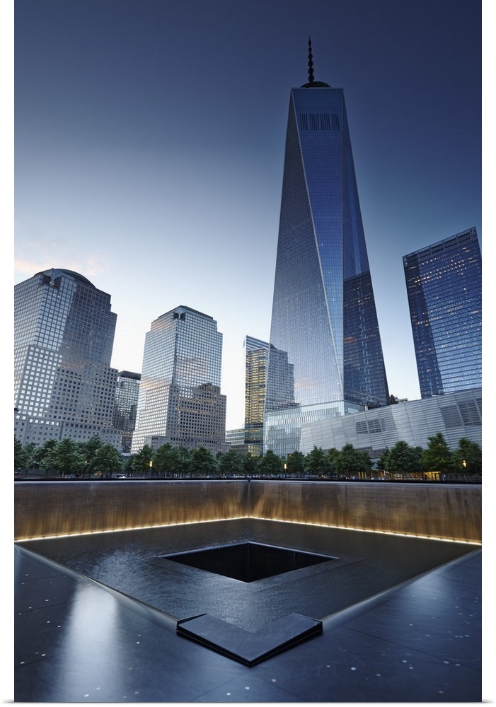 <p>USA, New York City, Manhattan, Lower Manhattan, One World Trade Center, Freedom Tower, Ground Zero memorial at the site of the World Trade Center.</p>