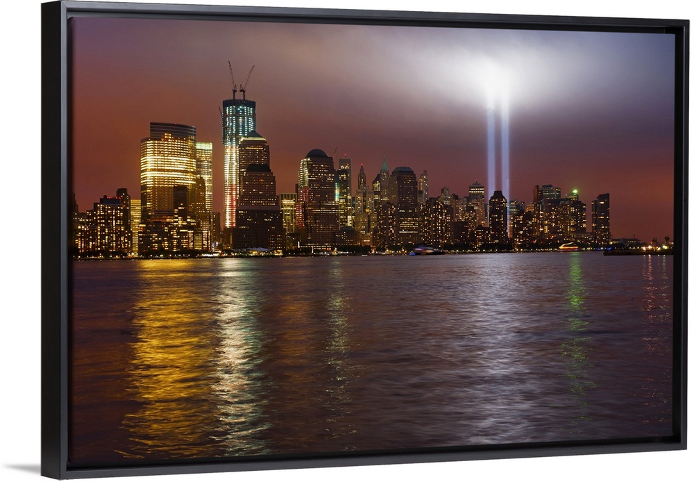 <p>Large, horizontal photograph of New York City, the Manhattan skyline at night, with 9/11 memorial lights.</p>