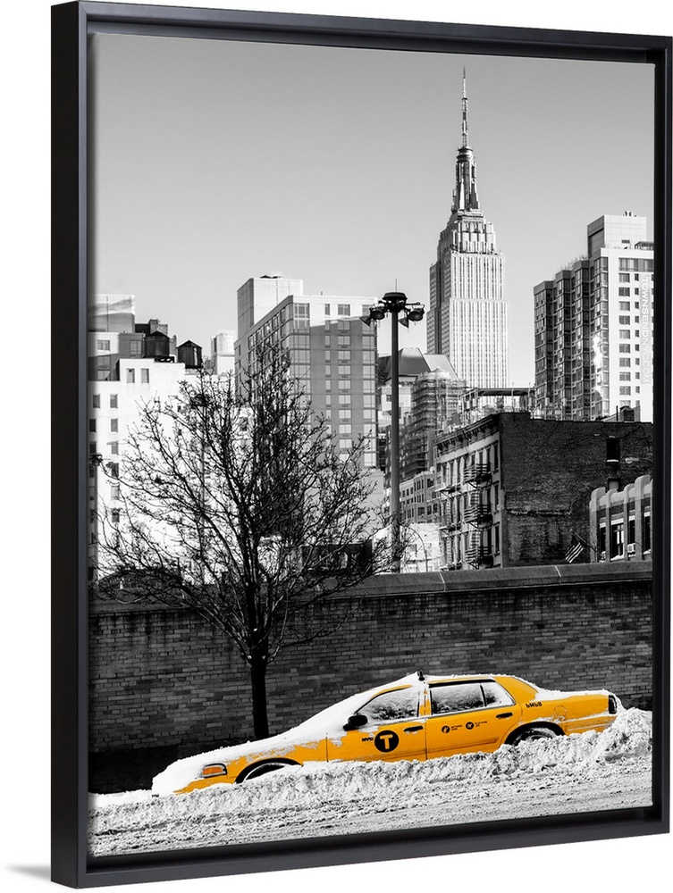 <p>A photograph of a yellow taxi cab in Manhattan in winter.</p>