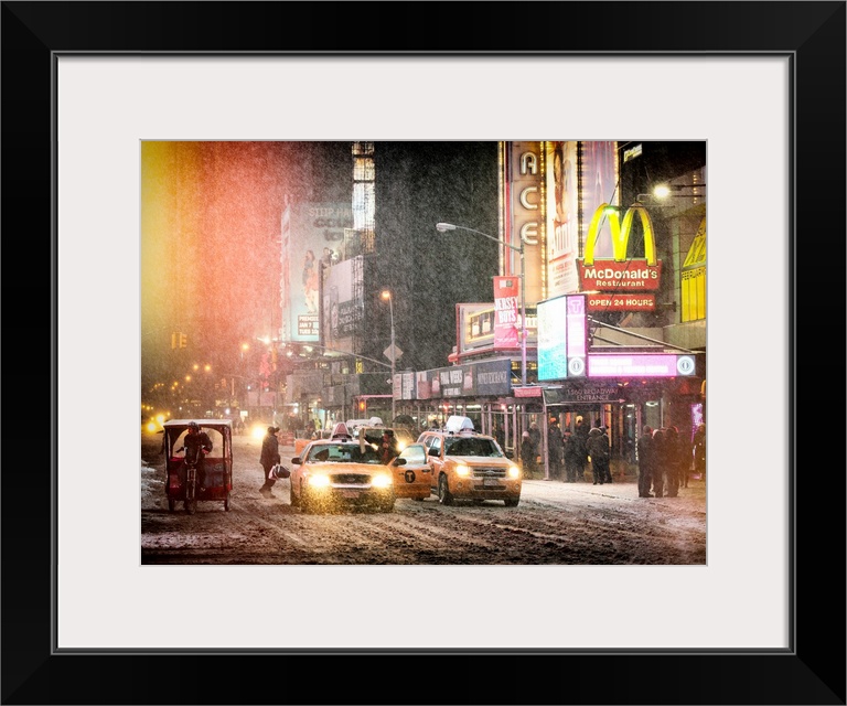 <p>A photograph of New York city at night, with neon light shining bright through the falling snow.</p>