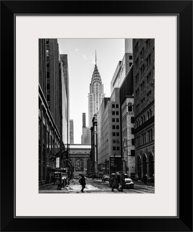<p>A black and white photograph of the Chrysler building standing tall in NYC, seen from street level.</p>